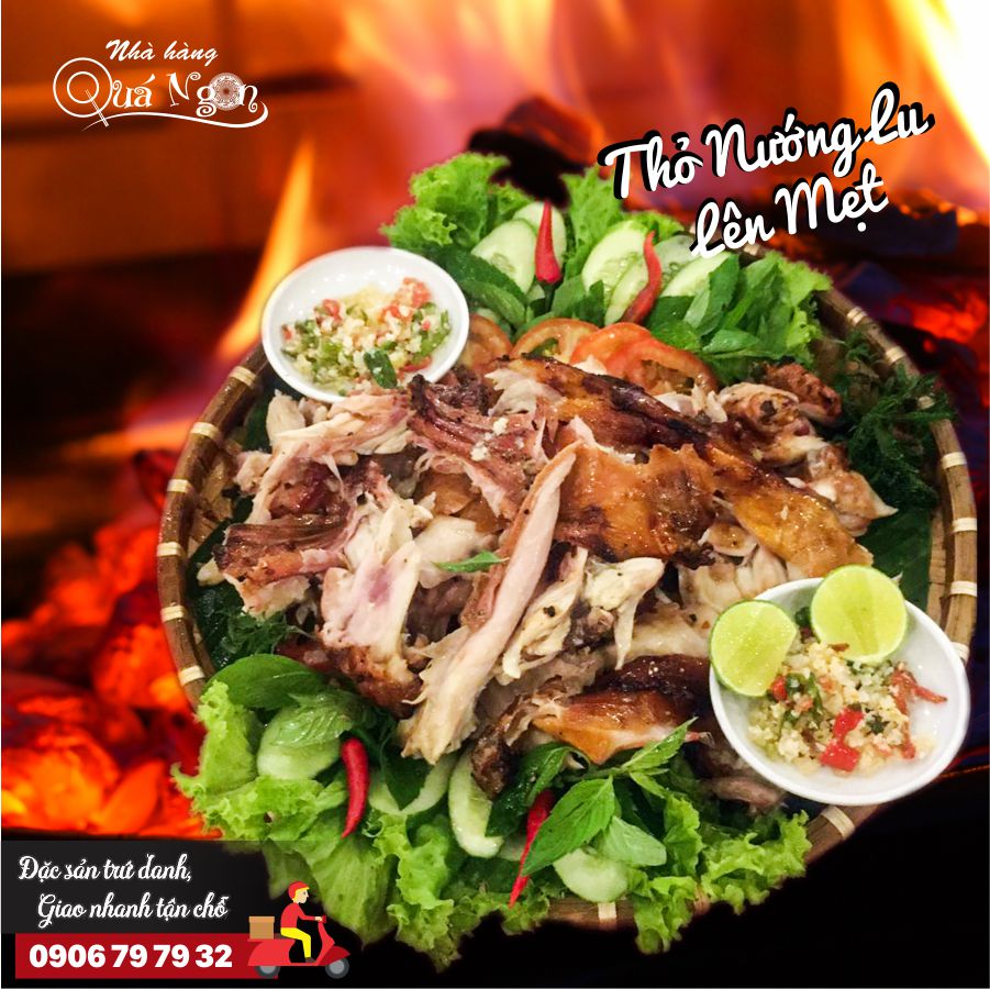 💥 Đặc sản THỎ NƯỚNG LU LÊN MẸT của Nhà hàng Quá Ngon được đầu bếp chế biến công phu, ướp với các gia vị thiên nhiên hảo hạng, nướng chín từ từ trong lu đất với than hồng nên khi món ăn hoàn thành và xé phay trình bày lên mẹt tại nhà khách, thịt nóng hổi, màu sắc bắt mắt, hương vị đặc trưng, dậy mùi thơm xao xuyến.
