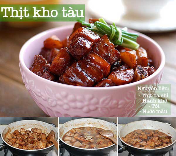 – Phi thơm hành tím rồi cho thịt ba chỉ vào đảo trong khoảng 7-8 phút, đến khi miếng thịt hơi nâu lại. Sau đó, hòa một chút đường, nước mắm, xì dầu với nước rồi đổ vào nồi, đậy nắp rồi tiếp tục đun trong 6-7 phút.