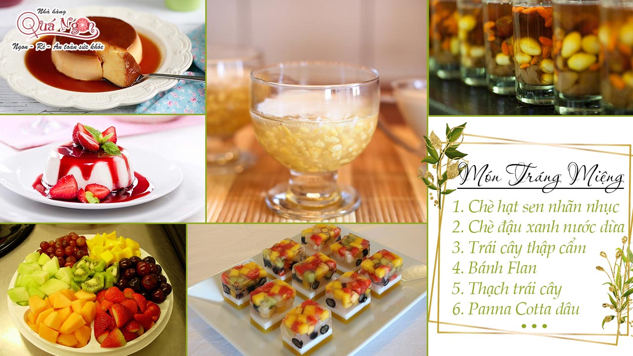 Với xu hướng tiệc hiện nay, món tráng miệng cũng được chú trọng như món chính, được xem như điểm nhấn cô đọng cho bữa tiệc. Món tráng miệng được được dọn lên sau cùng, khi thực khách đã thưởng thức hết các món ăn. Đó có thể là những món tráng miệng đơn giản như hoa quả trưng bày ra dĩa, các món chè truyền thống, kem,..