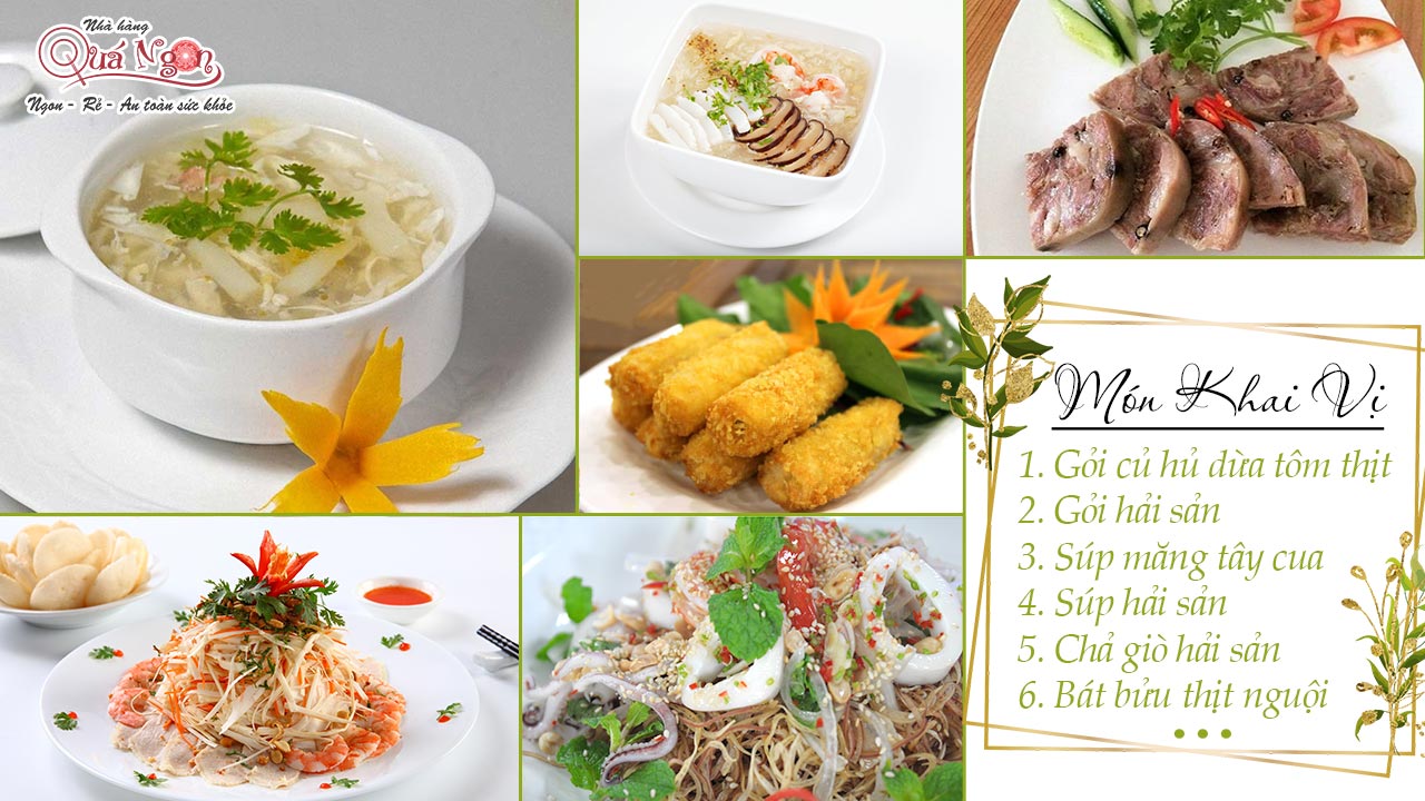Món khai vị là món mở đầu quan trọng trong mỗi buổi tiệc. Bao gồm những món ăn nhẹ, kích thích sự ngon miệng của thực khách. Trong các bữa tiệc, món khai vị thông thường sẽ có các món như: Gỏi bò tắc non cà pháo, Gỏi củ hủ dừa tôm thịt, Gỏi mực khoai môn, Soup hải sản bí đỏ, Soup cua,…