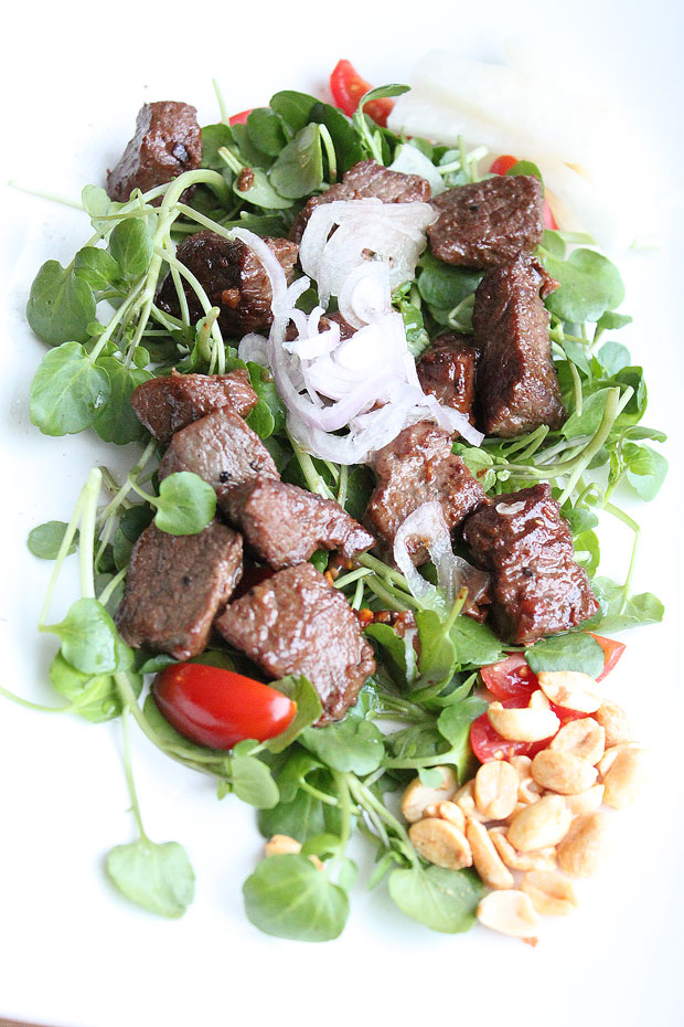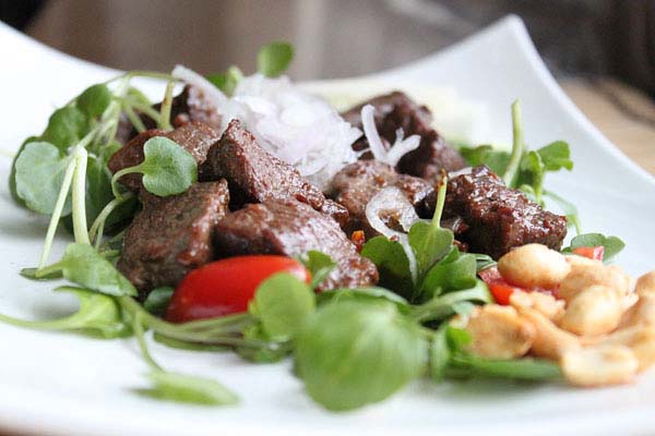 Cuối cùng, trước khi dùng bạn cho thịt bò ra đĩa, trang trí với ít xà lách xoong, cà chua bi và đậu phộng rang xung quanh, sau đó gắp ít củ hành lên.
