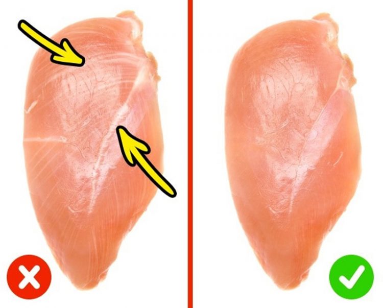 Thịt gà: Nếu miếng ức gà có nhiều sọc trắng và lớp mỡ dày, cho thấy khi gà còn sống đã được tiêm các hormone tăng trưởng để tăng cân nhanh. Các loại thịt này không tốt cho sức khỏe. Ngoài ra, thịt gà có màu vàng sẽ không còn tươi. Phần ức gà tươi sẽ có màu hồng và không quá mềm.
