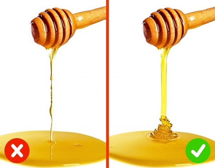 Mật ong: Đổ một ít mật ong ra chén hoặc dĩa. Mật ong đươc pha sẽ nhỏ giọt và lan nhanh ra bề mặt phẳng. Mật ong thật khá đặc, tạo thành giọt dày. Khi nếm mật ong, nếu có vị caramel nghĩa là mật ong đã được nấu từ đường, còn có vị ngọt quá mức, nồng nghĩa là nó chứa quá nhiều đường. Ngoài ra, nhận biết mật ong thật hay giả còn nhiều cách như bỏ vào ngăn đông tủ lạnh, nếu là mật ong thật thì sẽ không bị đông lại, còn mật ong giả sẽ có lớp đường bị đông lại.
