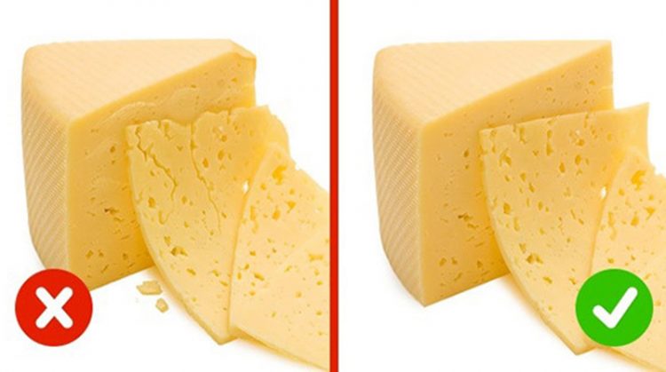 Phô mai miếng: Khi bạn cắt mỏng miếng phô mai, nếu có chứa chất béo thực vật, nó sẽ bị vỡ vụn và khô. Ngoài ra, để một ít phô mai ở nhiệt độ phòng, phô mai nguyên chất sẽ khô và nhẹ hơn. Phô mai chất lượng kém sẽ có nước.