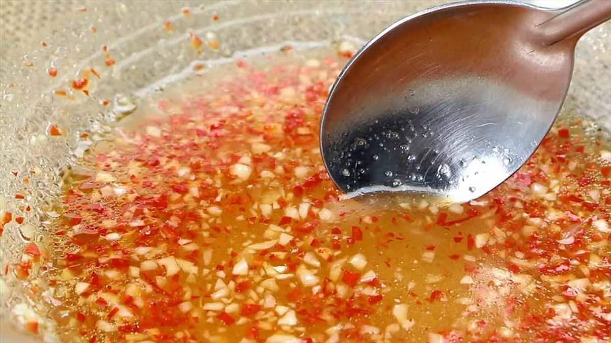 Bạn cho chảo lên bếp đun sôi hỗn hợp nước mắm và đường, thấy sôi lăn tăn thì tắt bếp cho ra chén. Tiếp tục cho tỏi ớt băm, tương ớt và đường vào khuấy đều, nêm nếm vừa miệng
