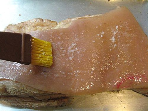 Bước 2: Nướng được 20 phút thì bạn bỏ thịt ra, quét thêm dấm lên bề mặt bì, như vậy bì sẽ sáng màu và ăn giòn hơn. Lúc này bạn tăng nhiệt độ lò lên mức nướng. Nếu thấy trên bề mặt bì có mỡ thì bạn dùng giấy thấm thấm đi bì sẽ rất giòn. Bạn cũng có thể lật mặt thịt lên nướng cho chín đều.