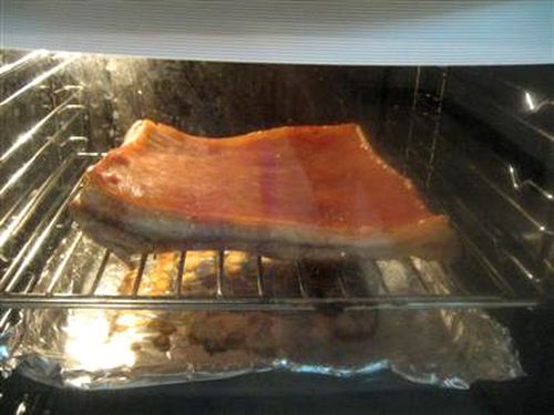 Bước 3: Bạn phải canh đến khi nào miếng thịt phồng và bì vàng giòn là được, thời gian nướng độ 40 – 45 phút. Phần bì phải chín kỹ nếu không ăn sẽ bị cứng và dai. Nếu phần bì có hơi bị cháy cũng không sao, bạn chỉ cần dùng con dao sắc cạo phần cháy đi là bì lại có màu vàng đẹp mắt. Lấy thịt ra khỏi lò, để nguội trong 15 phút rồi thái miếng.