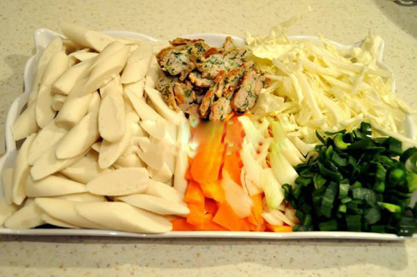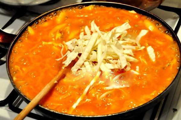 Bước 7: Cho bánh gạo và cà rốt vào nấu sôi thì cho bắp cải, hành tây vào đảo đều. Tiếp tục nấu cho đến khi nước đặc sệt lại thì cho hành lá vào rồi tắt bếp.