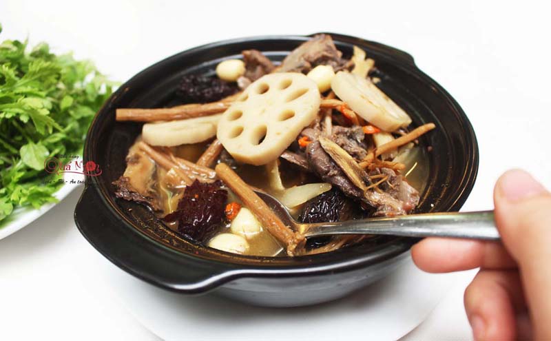 – Bỏ xương vào nồi nước sôi. Thêm táo tàu, củ sen, đẳng sâm, hạt sen,…hầm mềm trong khoảng 1 giờ đồng hồ.