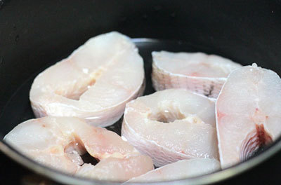 Bước 1: Cá lóc làm sạch, cắt khoanh, cho vào nồi nước sôi (có tí muối) luộc chín, vớt ra đĩa để riêng.