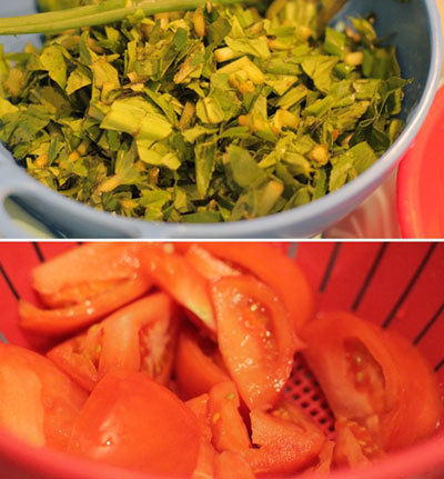 Bước 4: Mùi gai, rau ngổ rửa sạch, xắt nhỏ. Cà chua rửa sạch, xắt múi cau.