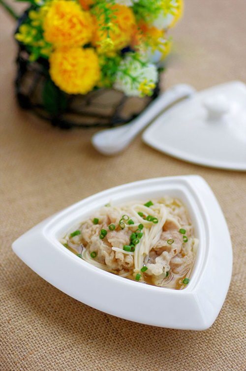 Chế biến món canh thịt nấu nấm kim châm rất đơn giản lại ngon miệng, một gợi ý hay để bạn đổi vị cho bữa cơm gia đình. Thịt đã thái lát mỏng dài, lại được luộc trước nên không cần thời gian đun nấu nhiều. Nấm kim châm cũng vừa chín tới giữ được toàn vẹn độ giòn ngọt.