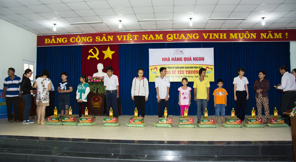 Mùa xuân là mùa của yêu thương, là dịp để sẻ chia với những mảnh đời kém may mắn. Hòa cùng không khí đó, chương trình từ thiện mừng xuân Bính Thân 2016 do Nhà hàng Quá Ngon phối hợp cùng Ủy Ban Nhân Dân phường Vĩnh Phú – huyện Thuận An – tỉnh Bình Dương tổ chức vào ngày 21-02-2016 xin góp một phần yêu thương dành cho các em nhỏ và gia đình có hoàn cảnh khó khăn tại phường Vĩnh Phú. Chúc các em cùng gia đình một năm mới tràn ngập niềm vui và hạnh phúc.
