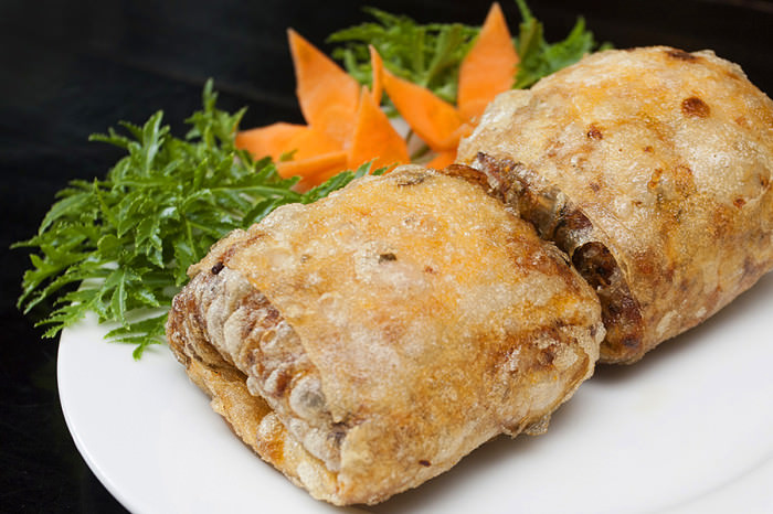 Bước 4: Trải bánh ra đĩa, cho nhân vào giữa và gói vuông. Sau khi gói hết tất cả, đem chiên bánh ngập dầu trong chảo nóng. Khi bánh vàng giòn, vớt ra và thấm bớt dầu bằng giấy thấm.