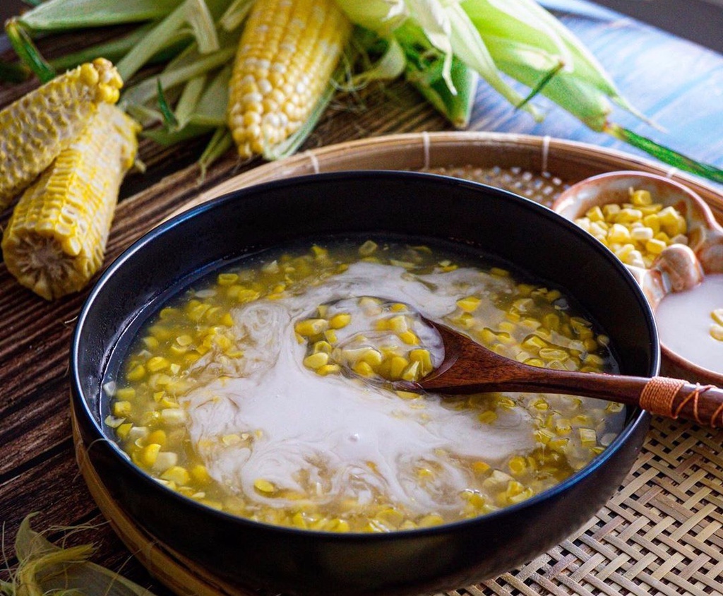 Chè bắp: Nếu có cơ hội tới phố cổ Hội An, bạn nên một lần nếm thử cốc chè bắp dân dã bên gánh hàng vỉa hè. Chè bắp được làm từ những hạt ngô ngọt thơm nhất. Ngô sau khi bào mỏng sẽ đem nấu cùng nước đường, khi chín cho thêm bột năng để tạo độ sệt. Cốc chè bắp thường được rưới chút nước cốt dừa lên trên để tăng độ béo. Ảnh: _thefoodcouple_.