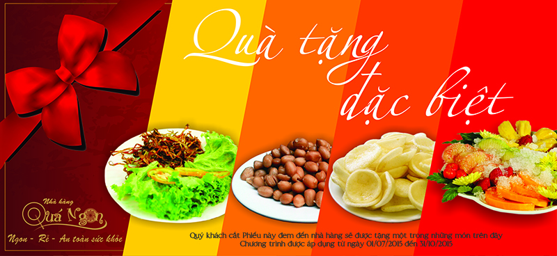 Nhà hàng Quá Ngon trân trọng giới thiệu chương trình ưu đãi chào hè đặc biệt 2015. Cụ thể khi ghé thăm Nhà hàng Quá Ngon Quý khách được tặng ngay một phần thức ăn “Kiều nữ và đại gia” hoặc các món hấp dẫn khác.