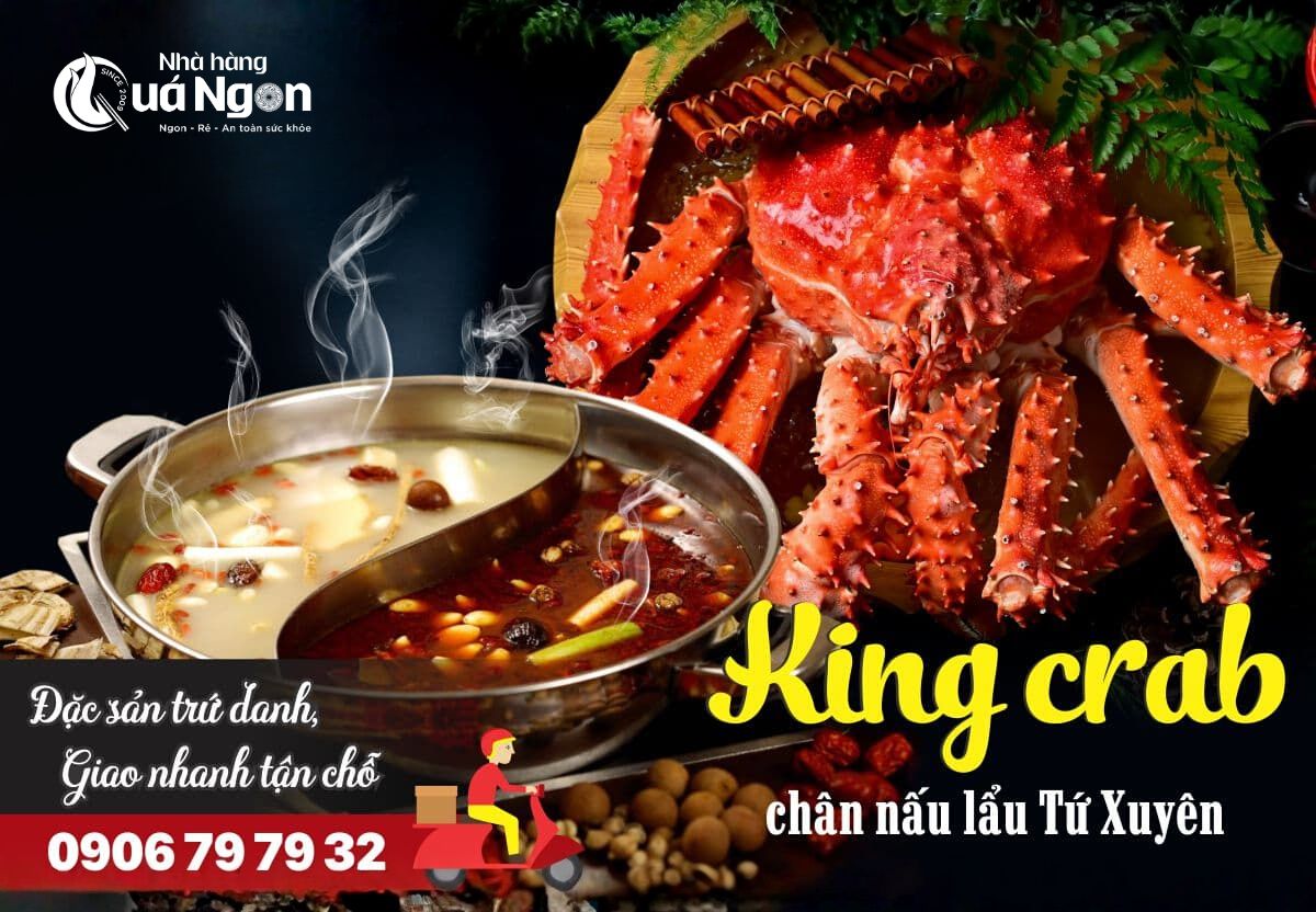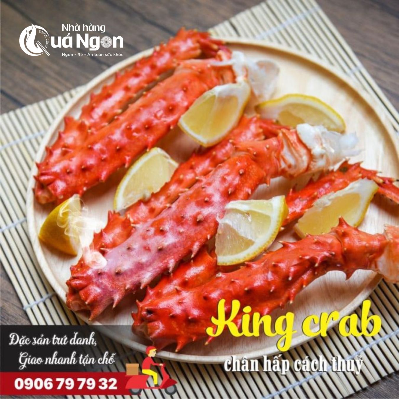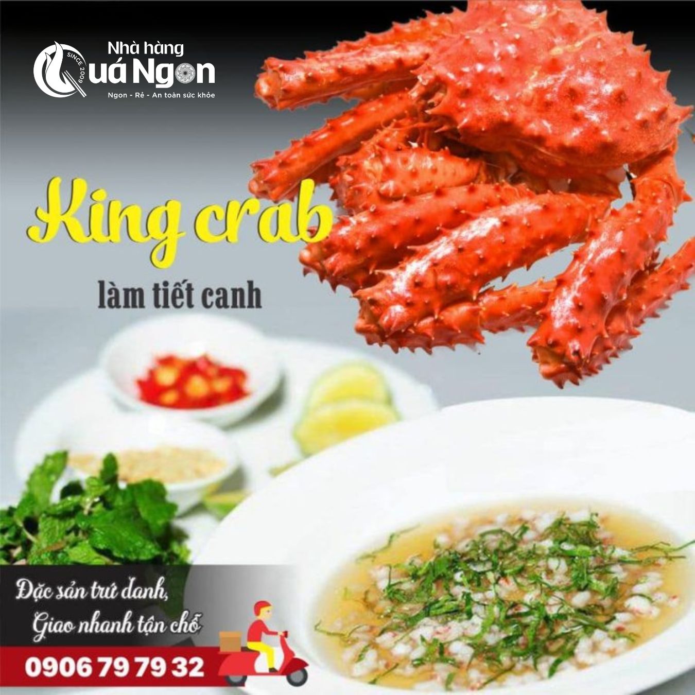 Nhà hàng Quá Ngon bán cua King Crab size: Từ 3kg – 5kg/con, khi giao tới nhà khách là cua sống, cân kg và chế biến tại chỗ. Cua King Crab được chế biến thành 3 món: Tiết canh + Thân nướng Phô mai + Càng cua hấp hoặc Nấu lẩu Tứ Xuyên, giá bán: 3.280.000 đồng/kg, Phí Ship và trình bày: 200.000 đồng/ lượt vận chuyển.