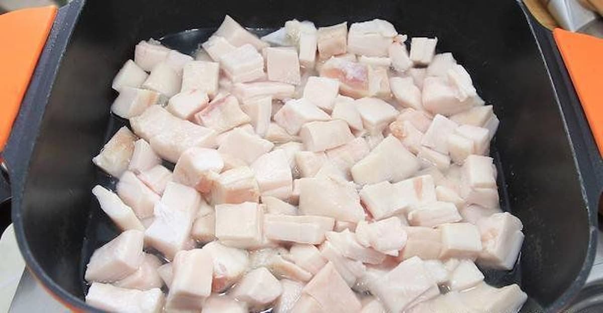 Sau khi sơ chế, làm sạch mỡ heo với nước muối loãng, bạn thái nhỏ và chần qua với nước sôi cùng vài lát gừng. Bước này sẽ giúp mỡ heo thơm, màu sắc hấp dẫn hơn.