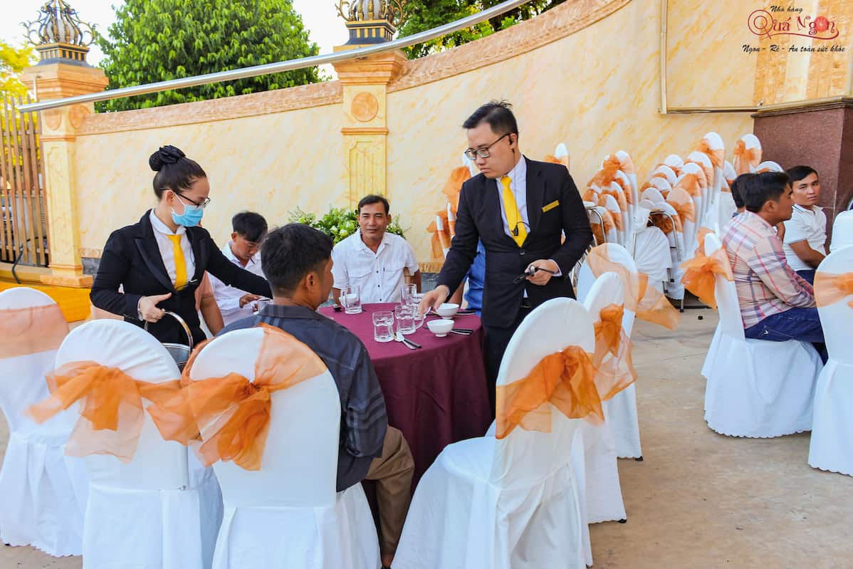 Đội ngũ nhân sự giàu kinh nghiệm và sự tận tâm sẽ giúp các đôi uyên ương chuẩn bị chu đáo tiệc cưới ngoài trời lãng mạn từ khâu lên ý tưởng trang trí, nấu nướng, phục vụ… để các bạn có thể yên tâm dành thời gian tận hưởng những khoảnh khắc ngọt ngào trong ngày hôn lễ mà không cần đắn đo lo lắng vì bất cứ điều gì.