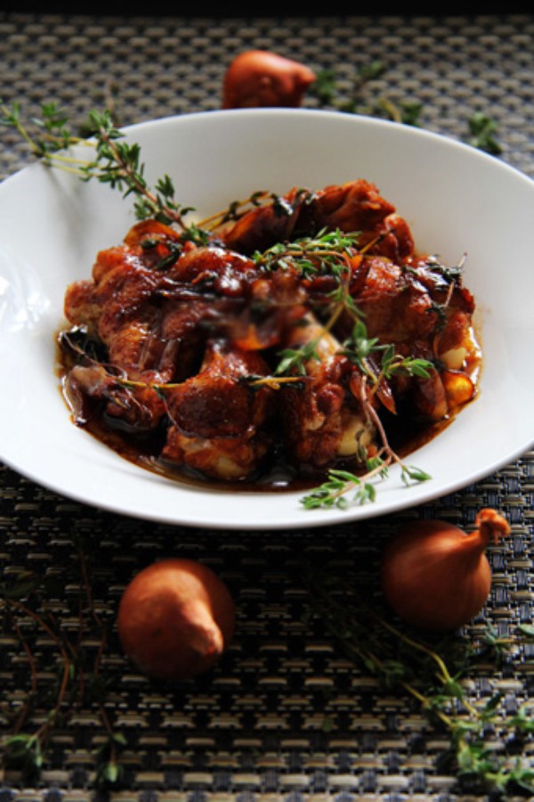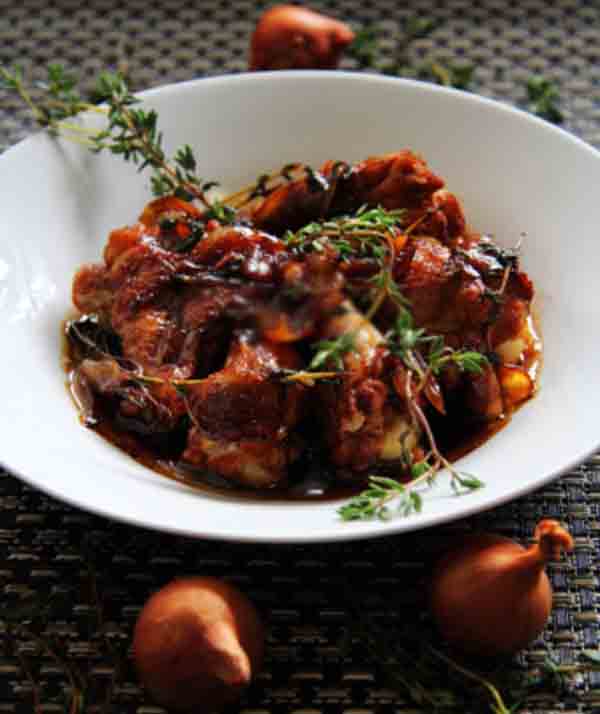 Xào đến khi gà bắt đầu chuyển màu hơi vàng thì thêm dầu hào, rượu vang, thyme tươi và ít nước vào, bật lửa lớn đun đến khi nước sôi thì bạn giảm nhỏ lửa, và đậy nắp om khoảng 40-60 phút.