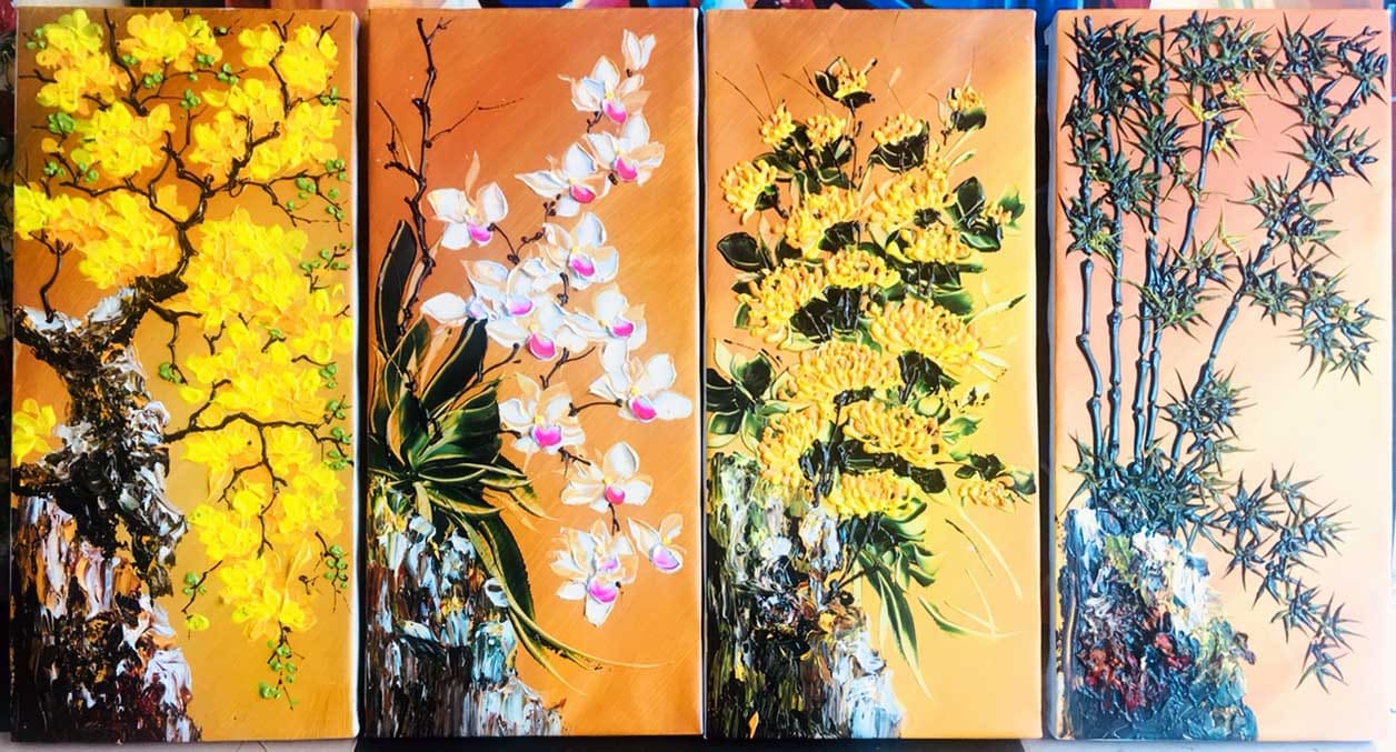 Một bức tranh nghệ thuật ý nghĩa có sức trường tồn qua nhiều năm tháng và đã trở thành món quà tặng sếp về hưu trang trọng, lịch thiệp nhất. Tranh tứ quý có những kiểu như: Tranh Mai – Lan – Cúc – Trúc hoặc Tùng – Cúc – Trúc – Mai. Tranh tứ quý mang ngụ ý thay cho lời chúc cuộc sống phú quý, bình an, may mắn và sức khỏe dồi dào.