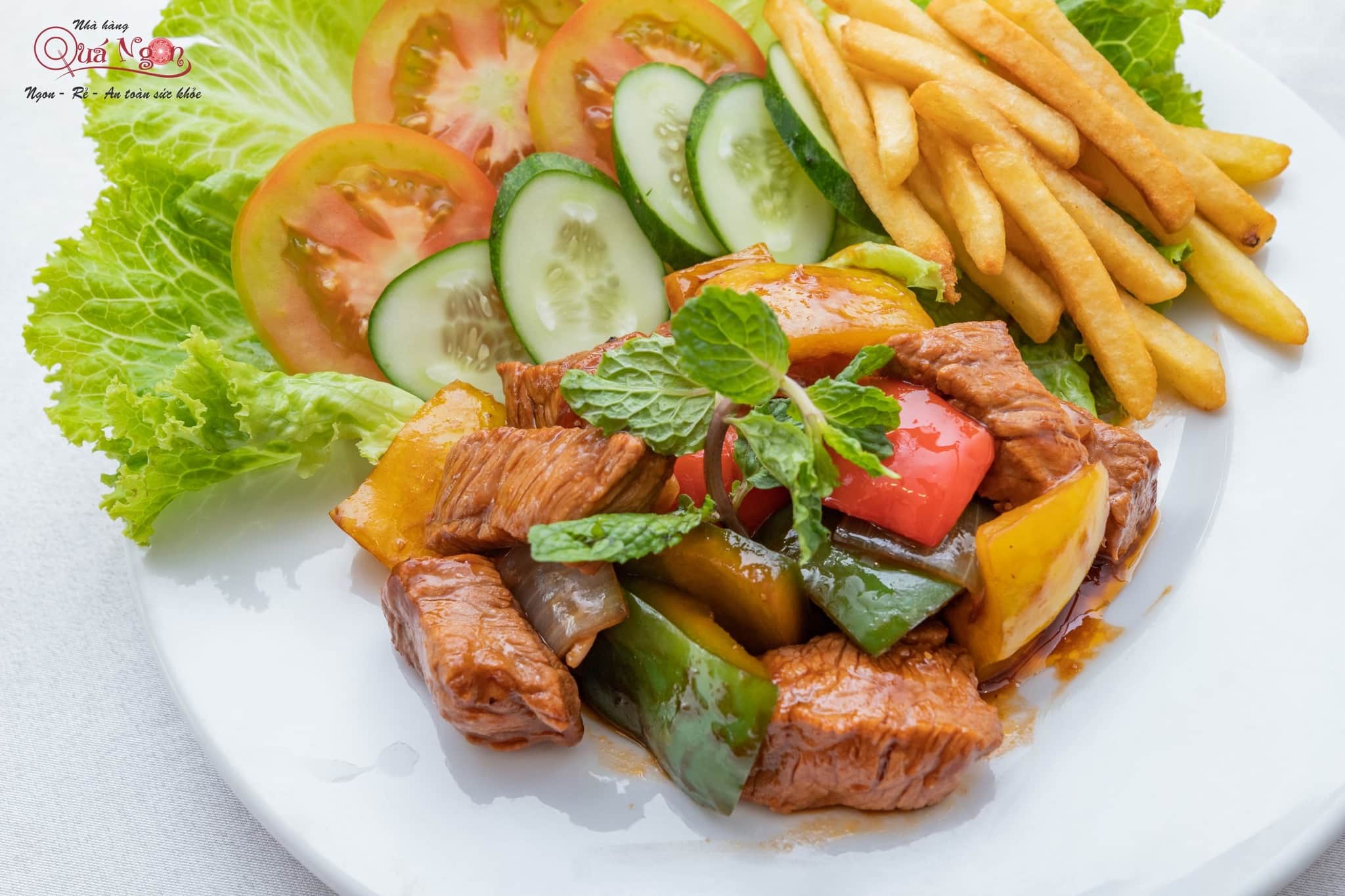 Một món ăn vào Giáng Sinh mang dấu ấn gần gũi nhất với ẩm thực châu Âu chính là bò lúc lắc khoai tây chiên. Thịt bò thượng hạng được tuyển chọn kỹ lưỡng và chế biến với bàn tay tài hoa của đội ngũ đầu bếp Quá Ngon sẽ chinh phục vị giác thực khách bằng vị thơm ngon, mềm dai vừa phải.