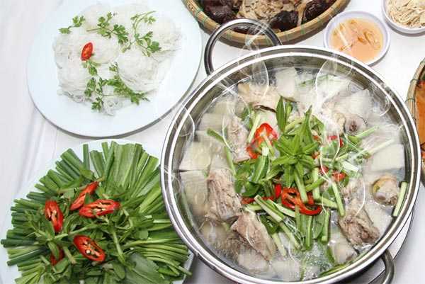 Phần còn lại đầu, xương, cẳng chân nấu Lẩu Khoai Sọ ăn với bún, rau thơm. Nước ngọt từ xương cùng với độ dẻo, bùi của khoai sẽ tạo ra vị nước lẩu thanh ngọt, bổ dưỡng.