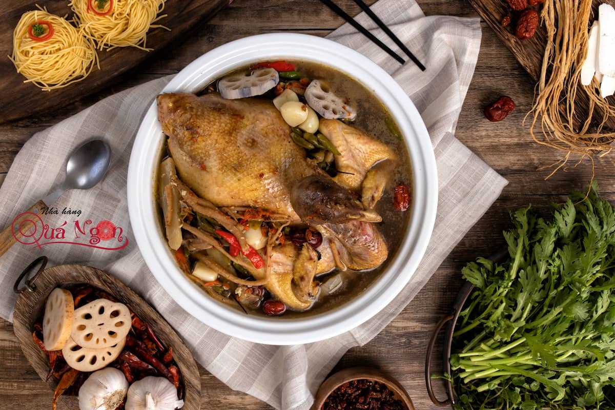 Lẩu gà tiềm ớt hiểm hấp dẫn không chỉ nhờ vị ngọt thanh thanh, cay nhẹ vừa đủ kích thích giác quan mà còn vô cùng bổ dưỡng khi kết hợp nhiều loại nguyên liệu tốt cho sức khỏe như gà, kỷ tử, ớt hiểm…Thật ra gà tiềm ớt hiểm không cay nồng, cay xé lưỡi như tên gọi mà chỉ là vị cay cay vừa đủ hấp dẫn nơi đầu lưỡi. Sức hấp dẫn nhất của món ăn chính là ở nước tiềm gà thơm ngọt, đậm đà rất khác biệt so với nhiều loại lẩu khác. Quá Ngon sẽ tùy theo nhu cầu và sở thích của khách hàng để lựa chọn thêm ớt hiểm nghiền nát hay giữ nguyên trái để giảm độ cay. Thực khách hoàn toàn yên tâm rằng dù bản thân không quen ăn cay vẫn có thể “đổi vị” để thưởng thức món ăn mang hương vị đặc trưng này.