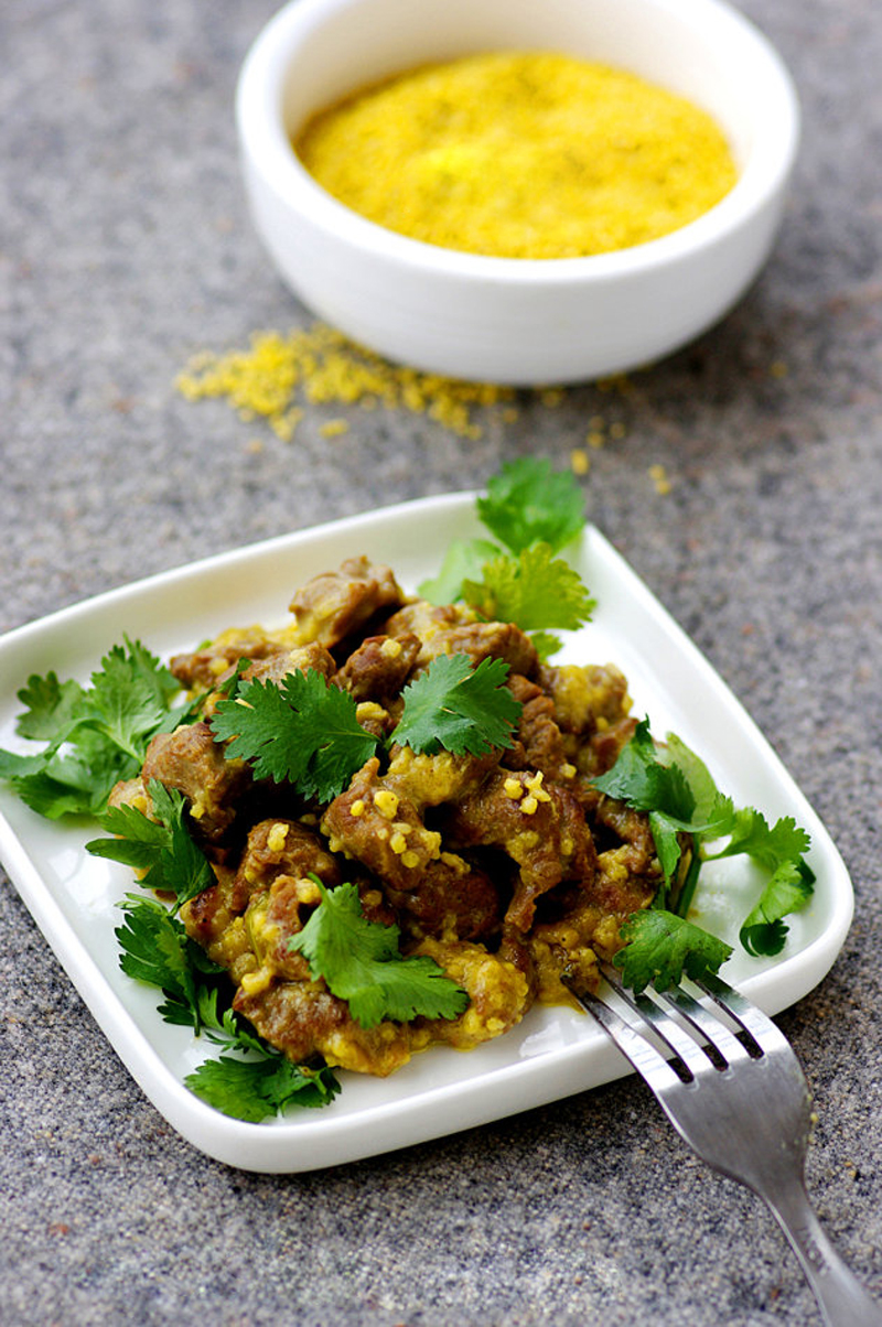 Nêm muối và tiêu vừa ăn, khuấy lại lần nữa cho thịt ngấm vị rồi đậy vung, đun nhỏ lửa cho đến khi nước xốt khô lại. Gắp thịt ra đĩa, bày lá mùi tươi trang trí cho đẹp mắt.