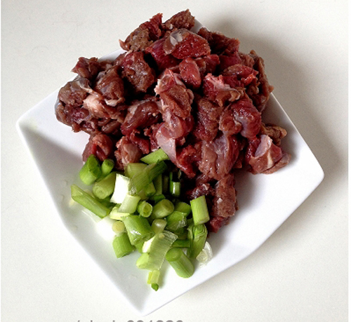Thịt bò chọn phần thịt có lẫn gân để khi kho không bị khô. Sau khi rửa sạch, cắt thịt bò thành những miếng vuông cỡ 2cm. Hành bỏ rễ, cắt khúc nhỏ.