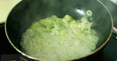Bước 1: Cho hành Baro đã xắt nhỏ vào chảo dầu phi đến khi vàng thì tắt bếp
