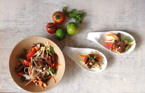 Chỉ trong vòng 10 phút bạn có ngay một đĩa gỏi xoài khô bò chua chua cay cay. Món này có thể dùng làm món khai vị hoặc làm món nhậu lai rai cho các anh xã nhâm nhi với ly bia mát lạnh trong cái nắng nóng của mùa hè.
