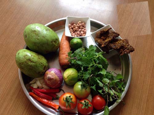 Đậu phộng cho lên chảo rang trong vòng 10 phút sau đấy giã nhuyễn. Hành tây thái khoanh rửa sạch ngâm với 1 muỗng cafe đường, 2 muỗng cafe giấm để trong vòng 5 phút. Xoài, cà rốt thái sợi.