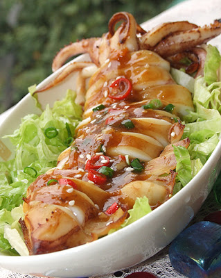 Xếp rau xà lách xuống dưới, đặt mực lên, tưới sốt và ăn ngay lúc nóng