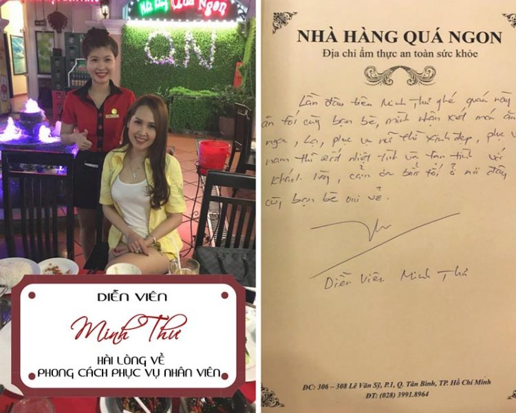 Thể hiện sự hài lòng về phong cách phục vụ của nhân viên ngay lần đầu tiên đến nhà hàng Qúa Ngon, Diễn viên Minh Thư nhận xét: “Lần đầu tiên Minh Thư ghé nhà hàng ăn tối cùng bạn bè. Mình nhận thấy các món ăn ngon, lạ, lại sạch sẽ. Phục vụ nữ thì xinh đẹp, phục vụ nam thì rất nhiệt tình và chu đáo với khách hàng. Cảm ơn nhà hàng Quá Ngon đã cho Minh Thư một thật buổi tối khó quên và vui vẻ!”