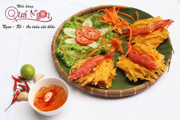Tưởng chừng như phải lặn lội đường xa hơn ngàn cây số để được ăn món bánh tôm Hồ Tây thì giờ đây ngay trong lòng Sài Gòn, Quý khách hàng cũng dễ dàng được thưởng thức bánh tôm Hồ Tây tại Nhà hàng Quá Ngon. Nhìn vỏ bánh giòn tan với con tôm ở giữa có màu sắc đẹp mắt mà chỉ thèm được chấm ngay vào chén nước mắm chua ngọt ăn cùng với rau sống. Bánh tôm Hồ Tây của Nhà hàng Quá Ngon như đem lại hương vị Hà Nội cho những người con miền Bắc.