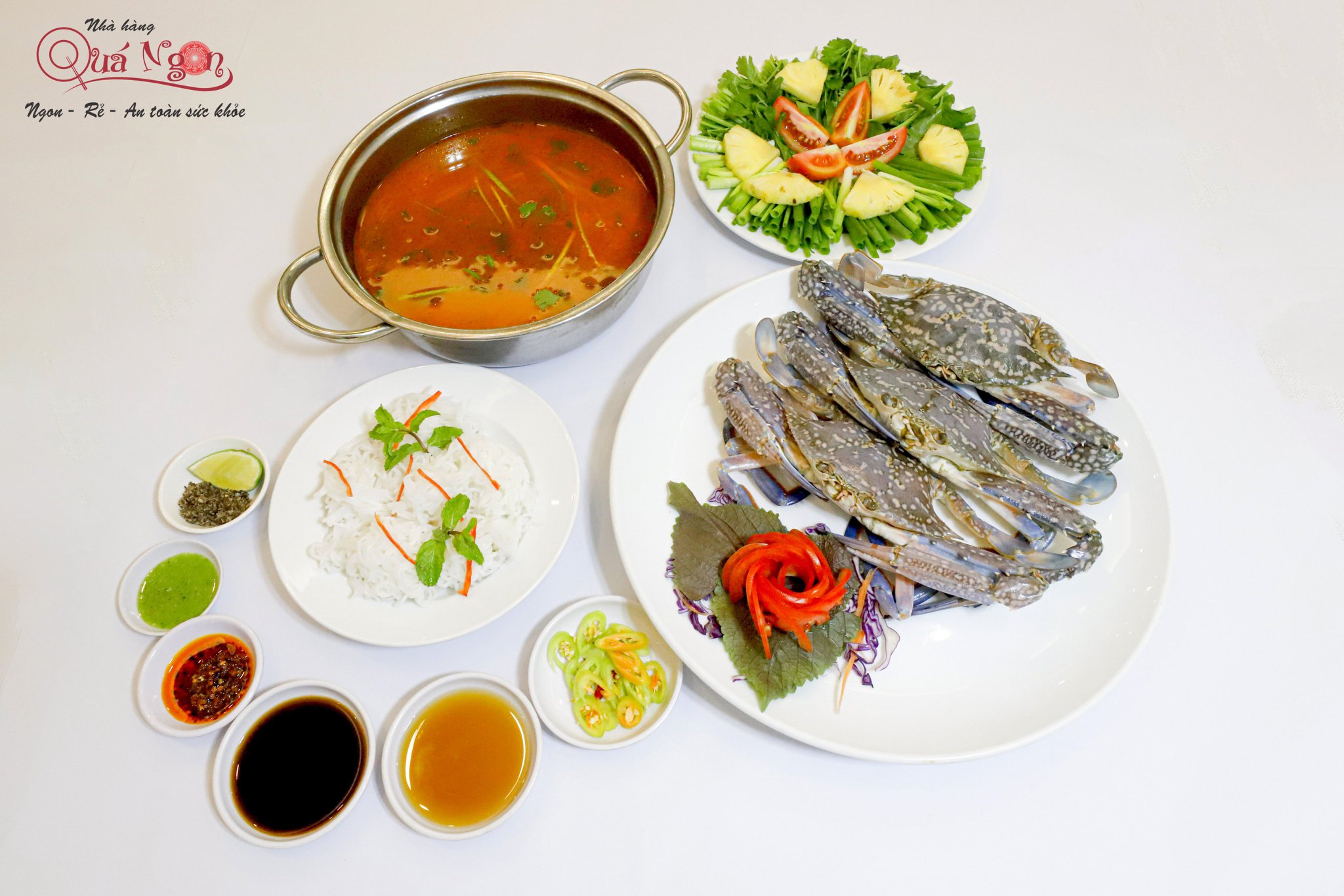 Ghẹ là món hải sản vừa sang trọng lại giàu chất dinh dưỡng canxi. Thông thường, chúng ta nghe nhiều về ghẹ hấp, luộc nhưng ít ai biết rằng lẩu ghẹ chua cay từ nhà hàng Quá Ngon lại có hương vị nồng nàn khó cưỡng. Món lẩu đậm đà chua chua cay cay lại không kém phần thanh ngọt từ thịt ghẹ, tôm, nấm, cùng hương thơm cay nồng từ sả, kết hợp với vị chua của cà, lá chanh… nếu dùng kèm với chén nước mắm mặn thì vô cùng tuyệt vời.