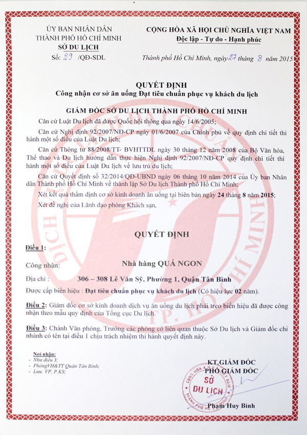 Giấy công nhận Cơ sở ăn uống Đạt tiêu chuẩn phục vụ khách du lịch do Sở Du lịch TPHCM cấp