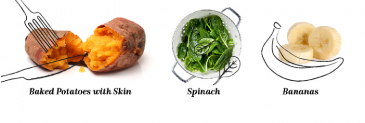 Kali: Giữ tim đập. Giảm nguy cơ của nhiều disesses và giúp các cơ hoạt động đúng. Khoai lan, chuối, rau chân vịt là những thực phẩm chứa nhiều Kali.
