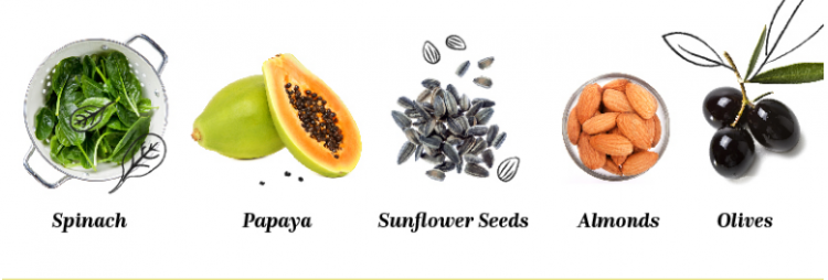 Vitamin E: Tăng cường hệ thống miễn dịch của bạn, cải thiện lưu lượng máu, và thúc đẩy việc sửa chữa mô. Thực phẩm bổ sung Vitamin E là những loại hạt, rau chân vịt, đặc biệt nhiều  nhất là dầu Oliu.