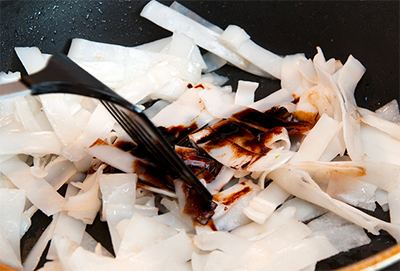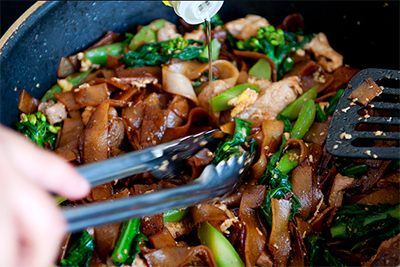 Bước 7: Cho hỗn hợp cải làn và thịt vào chảo phở đảo đều, nêm giấm, nước mắm và xì dầu cho vừa ăn thì tắt bếp
