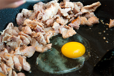 Bước 6: Bắt 1 chảo khác lên bếp, cho thịt vào xào sơ, sau đó gạt qua 1 bên để cho trứng vào, khi trứng hơi chín thì đánh đều để trứng tan ra.