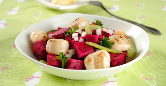 Cho thịt thanh long, cồi sò điệp, tôm, cần tây vào tô, cho xốt mayonnaise vào trộn đều. Cho salad thanh long và tôm ra đĩa, dùng ngay.