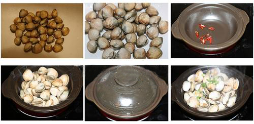 Cắt ớt vào nồi, cho sò vào, thêm nửa chén nước, tưới ½ chỗ rượu Sake vào. Bật bếp đun sôi. Đậy vung đun đến khi sò chín mở miệng.