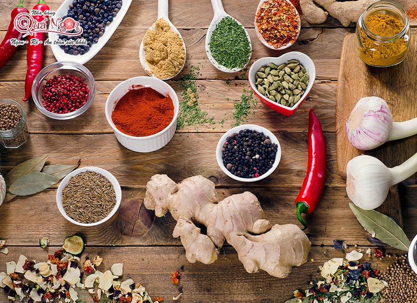 Muối, hạt nêm, hạt tiêu, rau mùi, hành củ.