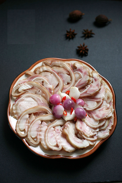Đổ nước ngập tai heo, đun sôi hớt váng mỡ, cho hồi, quê, thảo quả vào hầm nhừ. Vớt tai heo ra để ngăn mát tủ lạnh 2-3 tiếng.