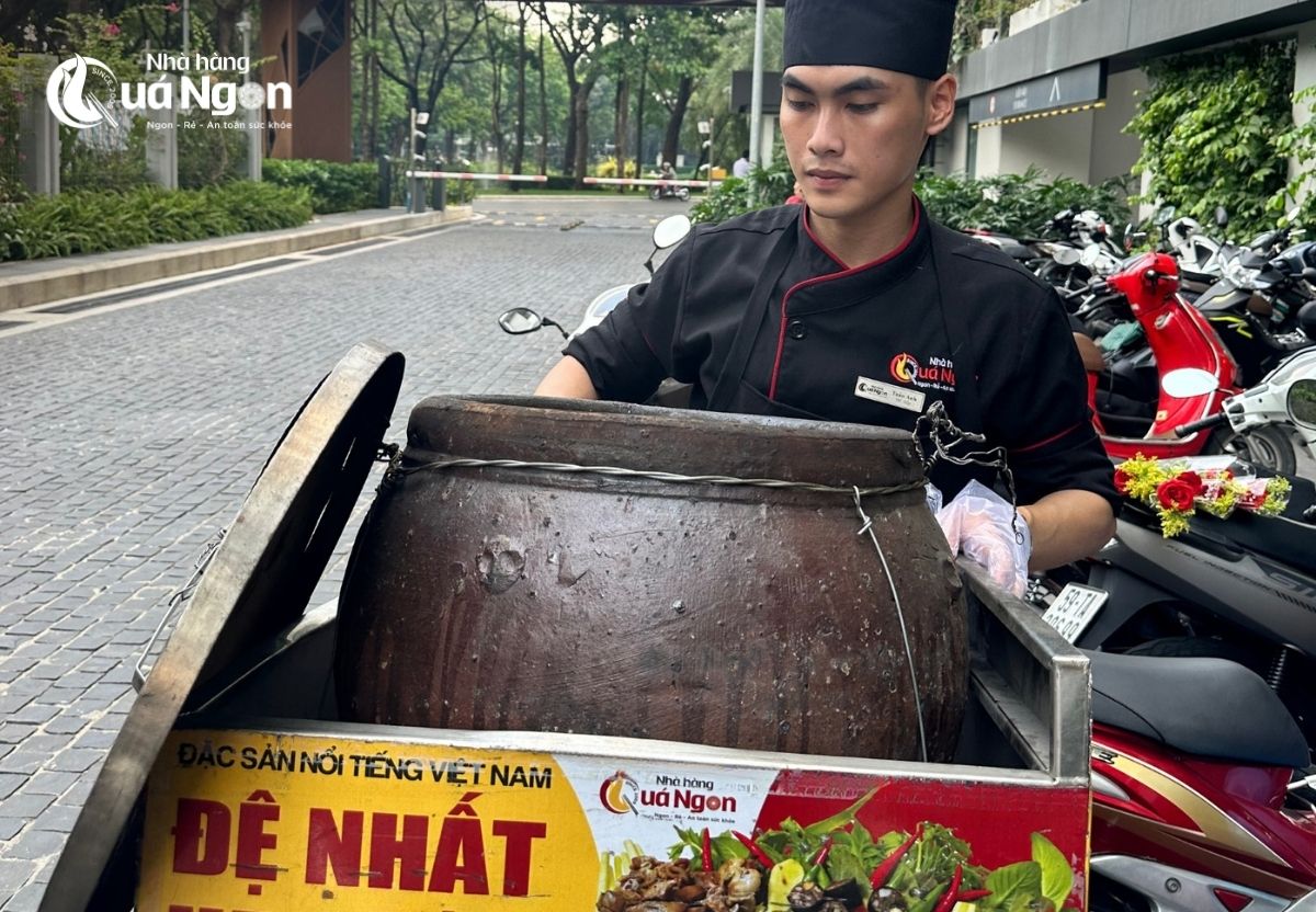 Qua Ngon’s hot-kiln delivery is not a standard food delivery service. Instead, it recreates the entire dining experience at home or at a chosen venue. The restaurant’s chefs bring a traditional earthenware kiln (lu đất nung) filled with live charcoal, ensuring that the dish remains hot, fresh, and full of flavor upon arrival.