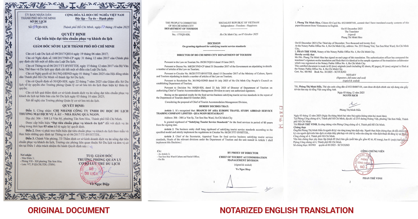 Ngày 07 tháng 10 năm 2025, Nhà hàng Quá Ngon (thuộc Công ty TNHH Du học Thương mại Dịch vụ A U) đã chính thức đón nhận Quyết định số 13/QĐ-SDL của Sở Du lịch TP. Hồ Chí Minh về việc Cấp biển hiệu đạt tiêu chuẩn phục vụ khách du lịch.