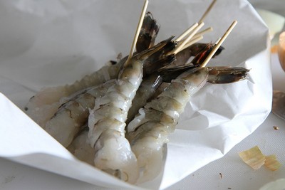 Trong lúc đó, bạn rửa sạch tôm, bóc bỏ vỏ, đầu và chỉ lưng, rồi dùng que xiên dọc sống lưng tôm. Sau đó, bạn nhúng tôm và hành tây khoanh qua phần bột ở bước 1 một lượt, sao cho tôm và hành được áo đều bởi bột.