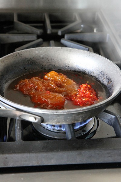 Làm nóng chảo sau đó bạn cho xốt chua ngọt, rượu gạo, nước tương nhạt và mứt mơ vào, khuấy đều và đun ở lửa nhỏ đến khi hỗn hợp tan đều vào nhau.
